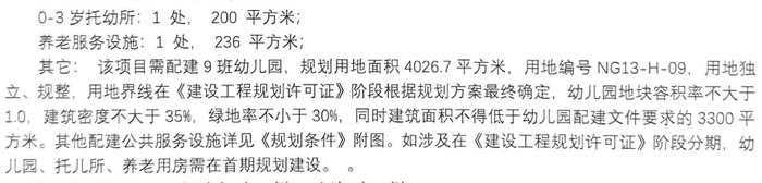 该地块规划为二类居住兼容商业设施用地,容积率约2.8,建筑限高80米,首期需配建9班幼儿园、托儿所及养老服务设施。