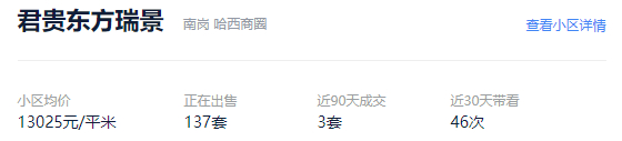 周边已建成住宅小区有君贵·东方瑞景,据贝壳找房数据显示,该小区均价13025元/㎡,近90天有三套成交,近30天有46次带看;隔哈西大街相望的柒零捌零城仕公馆,目前均价12954元/㎡,近90天有两套成交,近30天有39次带看,片区整体二手房市场活跃度较高。