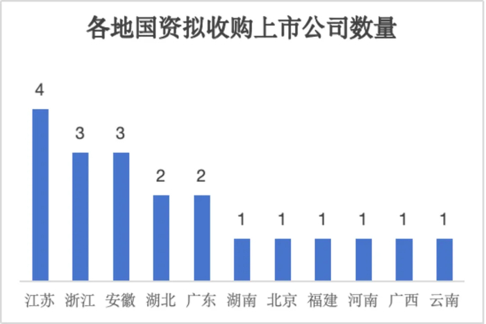 从地域分布来看,江苏国资表现最为活跃,年内宣布4起收购,浙江、安徽紧随其后,分别拟收购3家上市公司。值得注意的是,跨区域收购案例达到9起,占比接近一半。这反映出国资收购已突破地域限制,更加注重产业链的全局性整合。