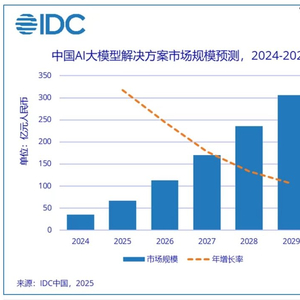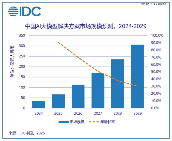 根据天眼查公开数据,及国际数据公司(IDC)最新发布的研究报告显示,2024-2029年中国模型即服务(MaaS)市场将以66.1%的年均复合增长率高速扩容,预计2029年市场规模将达到90亿元人民币。AI大模型解决方案市场同样保持高位增长态势,预计2029年整体规模达306亿元人民币。