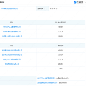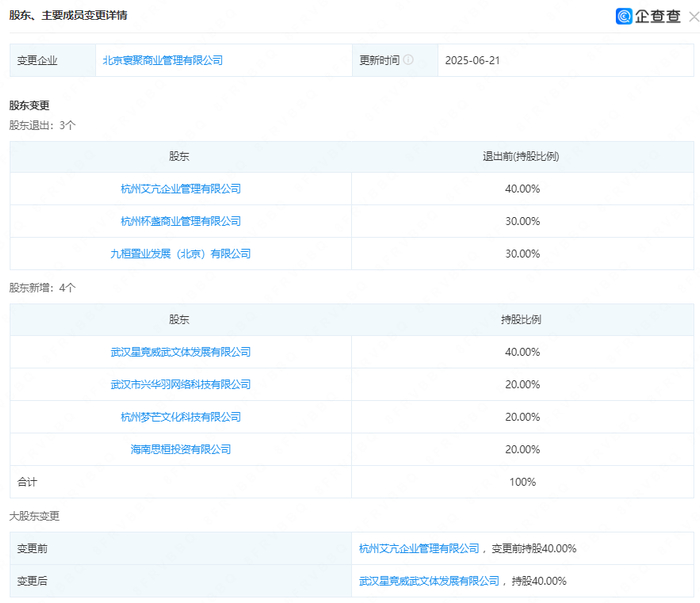 6月23日,记者发现,寰聚商业在近日发生股权变动,原有股东全部退出,武汉星竞威武文体发展有限公司、武汉市兴华羽网络科技有限公司、杭州梦芒文化科技有限公司、海南思恒投资有限公司成为新股东,分别持股40%、20%、20%、20%。