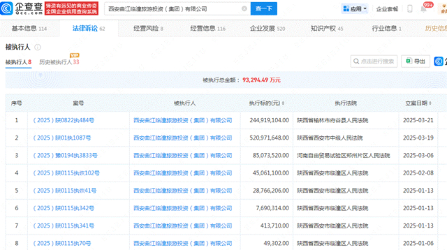 但企查查显示,今年以来,曲江临潼旅投先后8次遭到法院强制执行,被执行总金额超9.3亿元;2次被限制高消费,涉案金额超758万元。