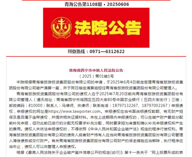 目前,这一破产清算案进入债权申报阶段。法院要求,2025年7月20日前,相关债权人要向青海旅投管理人申报债权,并书面说明债权数额、有无财产担保及是否属于连带债权,并提供相关证据材料。