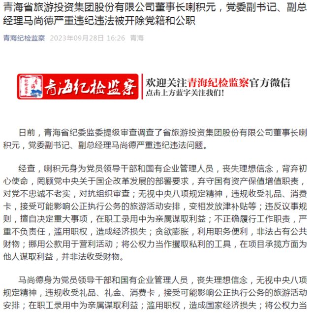 2023年5月,时任青海旅投董事长喇积元、副总经理马尚德同日落马,两人均因涉嫌严重违纪违法问题被调查。