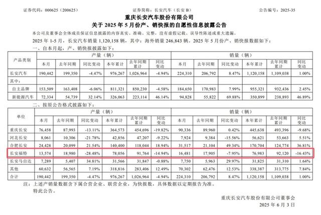 根据长安汽车公布的产销快报显示,5 月份长安福特销量为 16481 辆,同比下滑了 7.95%。虽说下滑幅度不算夸张,但这已经是长安福特进入 2025 年以来,连续第五个月销量同比下滑。今年1-5月份,长安福特累计销量仅有 7.6 万余辆,同比下滑 16.43%,成为长安汽车内部下滑幅度最大的一家。曾经在国内汽车市场辉煌一时的长安福特,如今销量持续走低,不禁让人思考,问题究竟出在哪里?