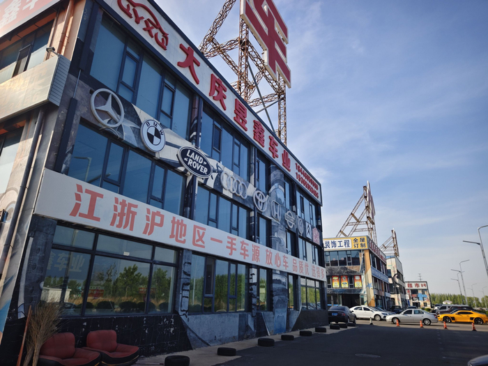 大庆市政府提供的数据显示,截至2024年底,大庆赛车小镇的二手车累计交易量近60万辆,交易额达到355亿元。赛车小镇的运营公司总经理王誉告诉第一财经,从单体面积上来说,这里已经是东北地区最大的二手车交易市场。“长三角发达地区的车,车况一般比较好,在我们这里特别受欢迎。”记者在现场也看到,某车业公司的楼体外,奔驰、宝马、路虎、奥迪等高端品牌的标识一字排开,标识下有醒目的大字写着“江浙沪地区一手车源”。