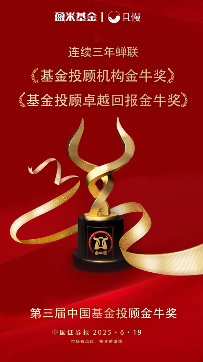 6月19日,由中国证券报主办的2025金牛财富管理论坛暨第三届投顾金牛奖颁奖典礼在上海举行。论坛上,“第三届基金投顾金牛奖”评选结果正式揭晓,盈米基金凭借在买方投顾领域的卓越回报表现和AI创新实践,一举斩获“基金投顾机构金牛奖”和“基金投顾卓越回报金牛奖”两项重磅大奖。值得一提的是,这也是盈米连续三年蝉联“基金投顾机构金牛奖”。