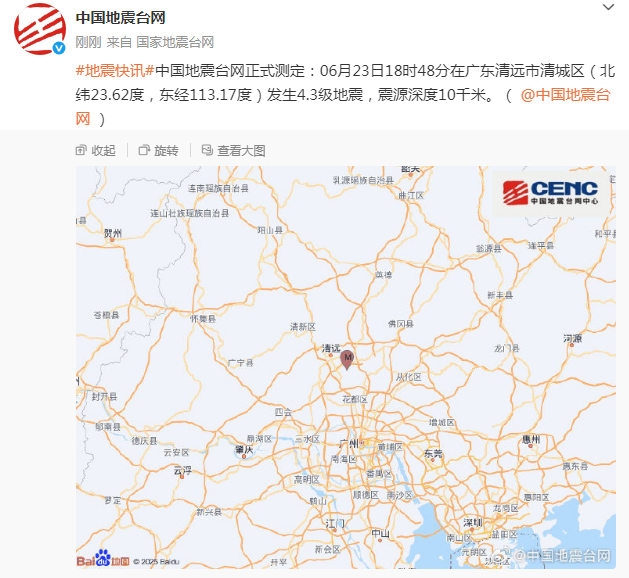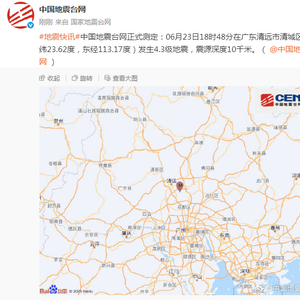 刚刚,广东清远发生4.3级地震 信息时报 2025.06.2319:03 关注 中国地震台网正式测定:06月23日18时48分在广东清远市清城区(北纬23.62度,东经113.17度)发生4.3级地震,震源深度10千米。