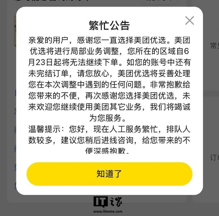 官方发布的“繁忙公告”提到,若账号中还有未完结订单,美团优选将妥善处理在本次调整中遇到的任何问题。