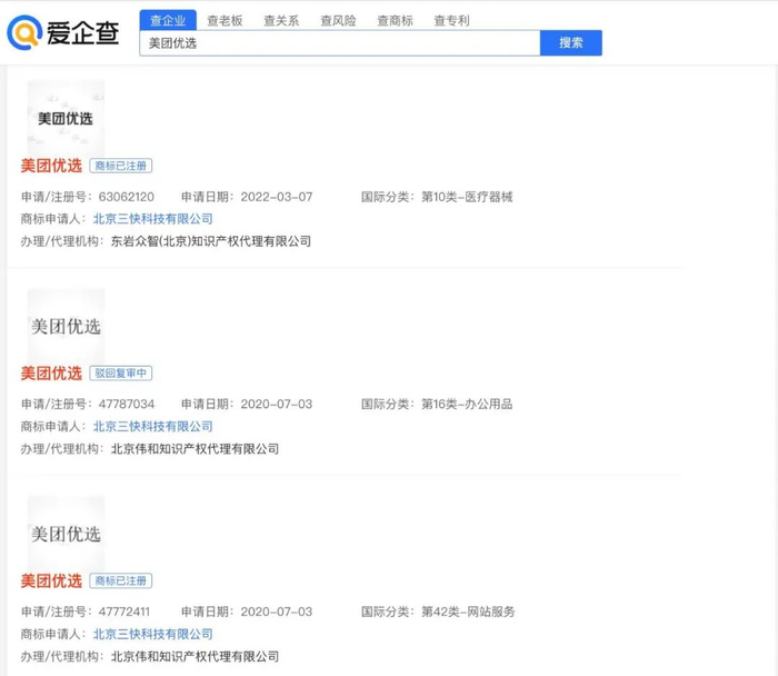 此外,美团关联公司北京三快科技有限公司已申请注册多枚“美团优选”商标,国际分类涉及网站服务、广告销售、医疗器械等,目前部分商标注册成功。