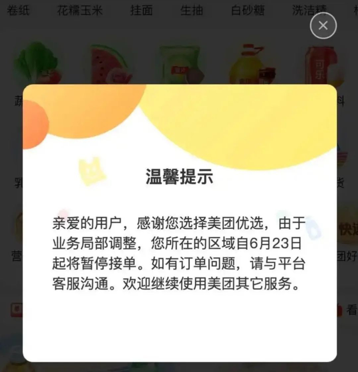 据齐鲁晚报,6月23日,有网友反映称,美团优选小程序无法下单,系统提示为“由于业务局部调整,您所在的区域自6月23日起将暂停接单。”