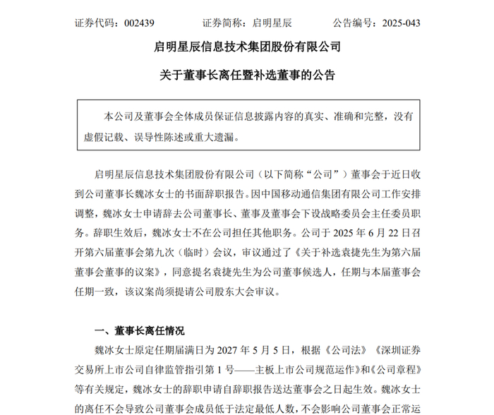 6月22日下午,启明星辰连发两份公告:董事长魏冰因中国移动集团工作安排调整,辞去公司董事长、董事及董事会下设战略委员会主任委员职务;同时,董事会提名中国移动网络与信息安全管理部副总经理袁捷为公司新任董事候选人。