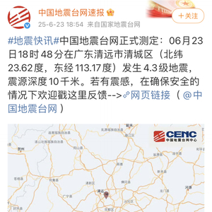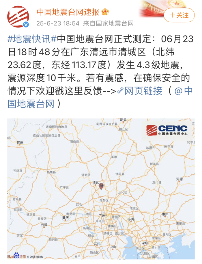 中国地震台网正式测定:6月23日18时48分在广东清远市清城区(北纬23.62度,东经113.17度)发生4.3级地震,震源深度10千米。