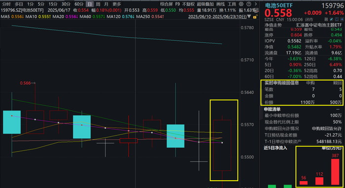 6月23日,固态电池概念再度走强,同类规模领先、费率处于最低档的电池50ETF(159796)拉长阳收涨1.64%,盘中再度获资金净申购超600万份,截至今日(6.23),电池50ETF(159796)已连续4日累计吸金超800万元!