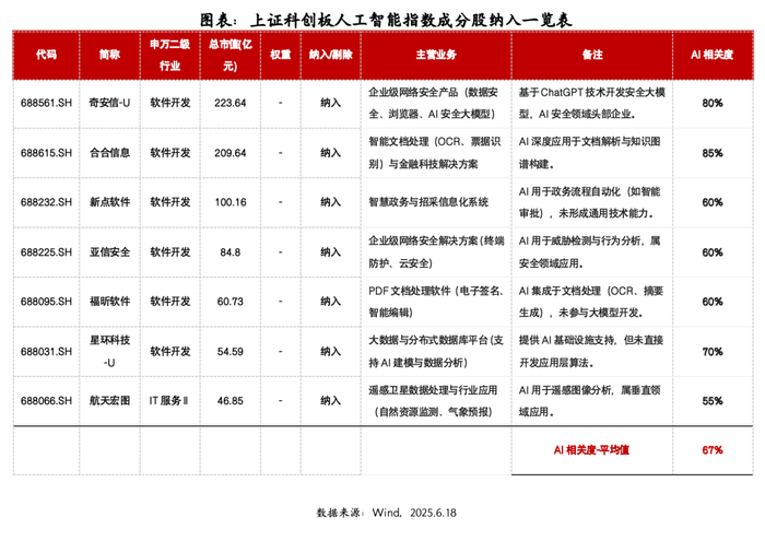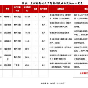 调入标的(7家):奇安信-U、合合信息、新点软件、亚信安全、福昕软件、星环科技-U、航天宏图。新成分股集中于AI安全、智能办公、遥感分析等高增长场景,平均AI业务收入占比达68%,有望提升指数在应用层的纯度。