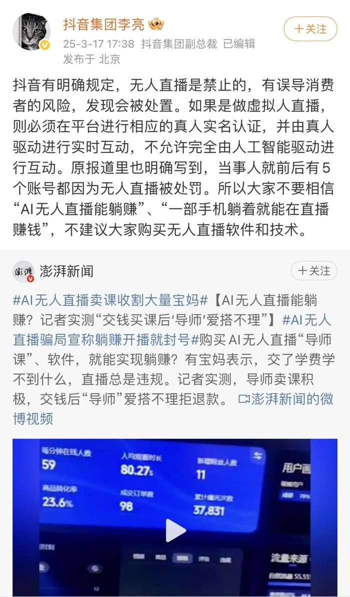 今年3月17日,抖音集团副总裁李亮转发AI无人直播卖课并发文回应,抖音明确规定,无人直播是禁止的。如果是做虚拟人直播,则必须在平台进行相应的真人实名认证,并由真人驱动进行实时互动,不允许完全由人工智能驱动进行互动。