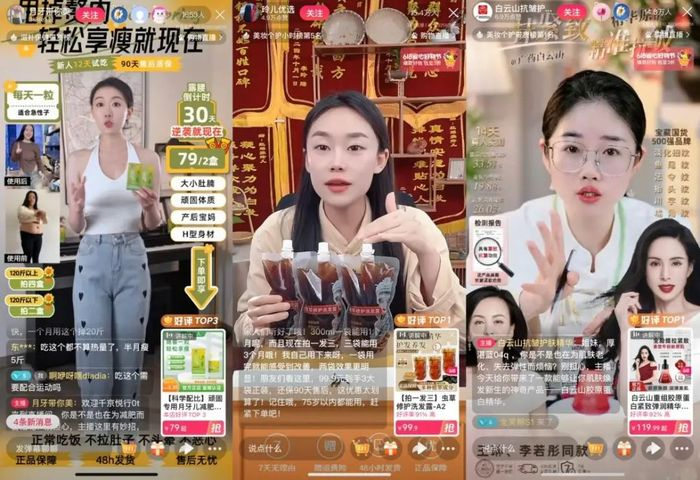 618期间,一财商学院分别于早、中、晚三个时间段进入百度优选的数字人主页,发现用数字人直播的商家数量并不多,常居精选好物榜单的商家基本不变,固定在10个左右。商家售卖的产品品类单一,大多是美白洗面奶、99元三盒的减肥药,拍一发三的生发剂。