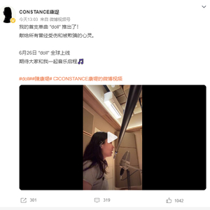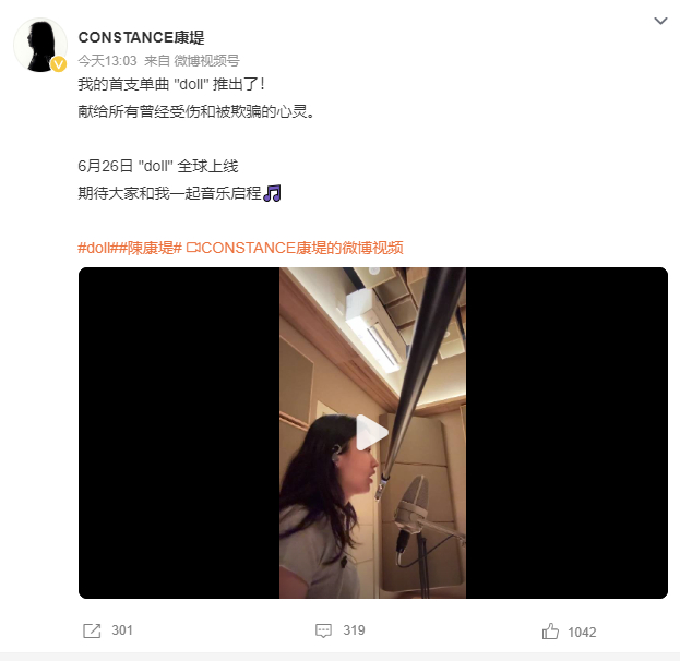 23日,陈康堤发文表示,歌曲《doll》将于6月26日全球上线,献给所有曾经受伤和被欺骗的心灵。