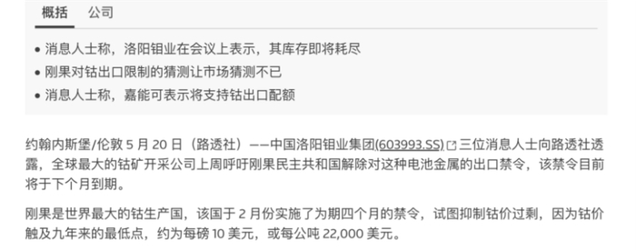 钴事,刚果金政府宣布延长3个钴临时禁令,洛阳钼业库存即将耗尽