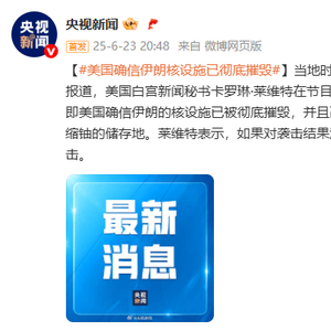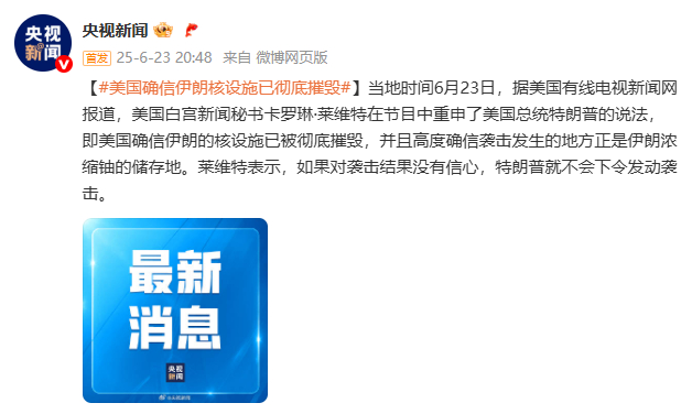 当地时间6月23日,据美国有线电视新闻网报道,美国白宫新闻秘书卡罗琳·莱维特在节目中重申了美国总统特朗普的说法,即美国确信伊朗的核设施已被彻底摧毁,并且高度确信袭击发生的地方正是伊朗浓缩铀的储存地。莱维特表示,如果对袭击结果没有信心,特朗普就不会下令发动袭击。