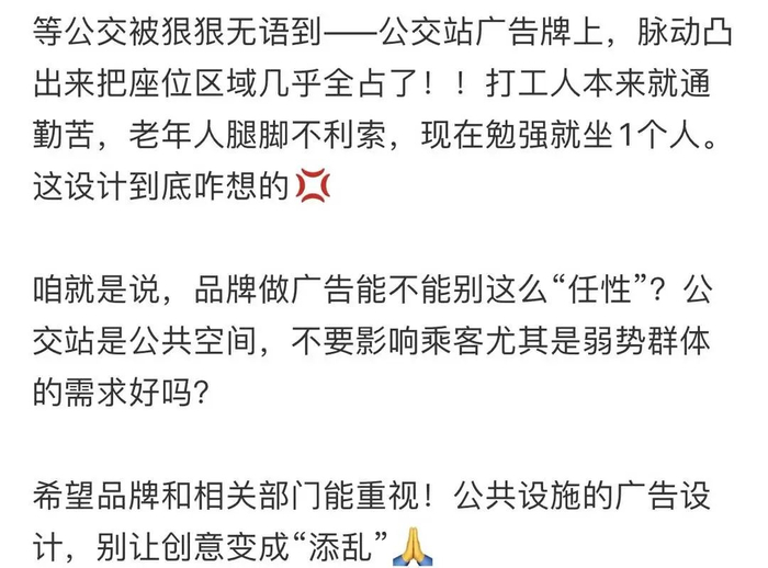 有广州网友在珠江泳场站的公交站台,看到凸出的瓶身把座位区域几乎全占了,抱怨“通勤上班本来就辛苦,老年人腿脚不利索,现在座位勉强就坐1个人”。有杭州网友反映,“没注意到公交车站更换了立体站牌,下了公交车看了眼手机,一头撞了上去”。有重庆网友反映,“本来就小的避雨空间被占了。这种凸起的广告,应该放在专门的立式广告牌上才对。”