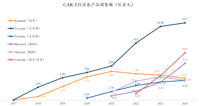 2024年,强生/传奇的Carvykti(西达基奥仑赛)潜能爆发,在全球吸金近10亿美元,跃居第二。BMS的Breyanzi也凭借多年稳扎稳打收获7亿美元,跻身第三。
