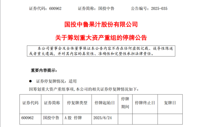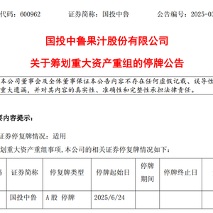 国投中鲁公告称,公司计划自6月24日开市起继续停牌,预计合计停牌时间不超过10个交易日。公司将在相关事项确定后及时发布相关公告,并申请公司股票复牌。