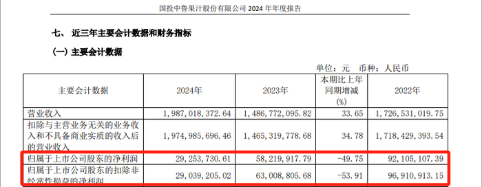 2022年至2024年,国投中鲁的归母净利润、扣非后净利润均持续下降。以2024年为例,国投中鲁的归母净利润为2925.37万元,同比下降49.75%;扣非后净利润为2903.92万元,同比下降53.91%。
