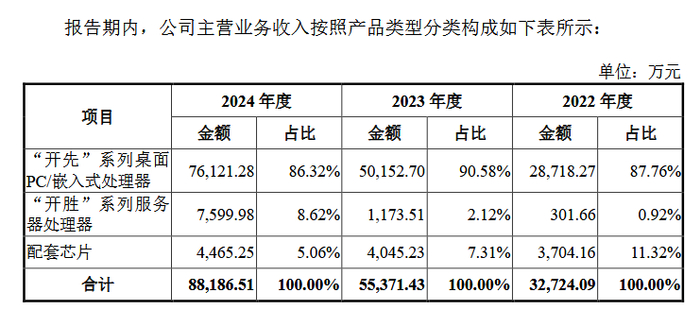 从收入构成来看,兆芯集成主要营收来自“开先”系列处理器,2022年、2023年及2024年,兆芯集成该产品线营收分别为2.87亿元、5.02亿元及7.61亿元,占总营收比例分别为87.76%、90.58%及86.32%。