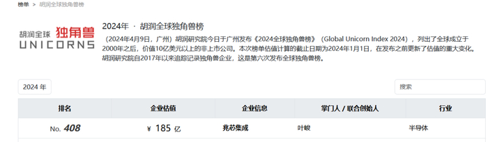 据胡润研究院《2024全球独角兽榜》,兆芯集成的估值为185亿元。而目前已上市的国产CPU厂商中,海光信息市值为3105亿元,龙芯中科市值为484亿元。