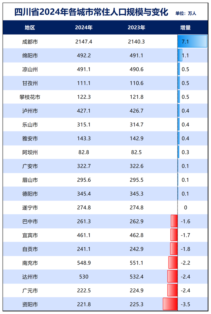四川:去年四川减少了4万人,下辖的21个市州,目前20个公布了数据。公布数据的20个城市,1个零增长,7个负增长,人口减少城市占比35%。