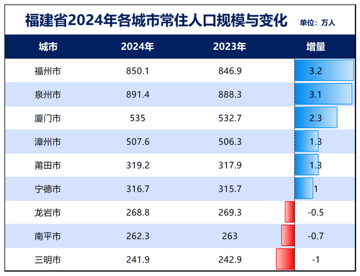 福建:福建省去年常住人口增加了10万,下辖的9个城市中3个人口在减少,人口减少城市数量占比33.3%。