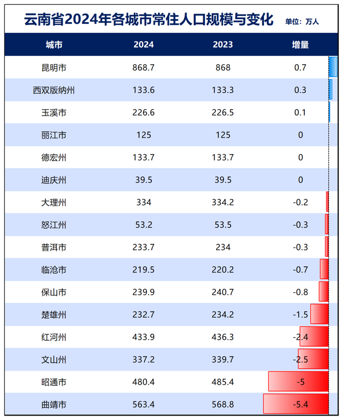 云南:去年云南省减少了18万人,下辖的16个市州,只有3个人口在增长,3个零增长,人口减少城市10个,占比62.5%。