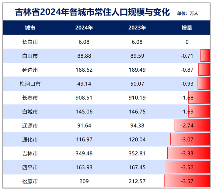 吉林:去年吉林省常住人口减少了22.1万人。其下辖的8个地级市、1个自治州无一城人口增长,长白山人口持平,其余包括省会长春在内的8个城市,人口都在减少,人口减少城市比例几乎百分百。