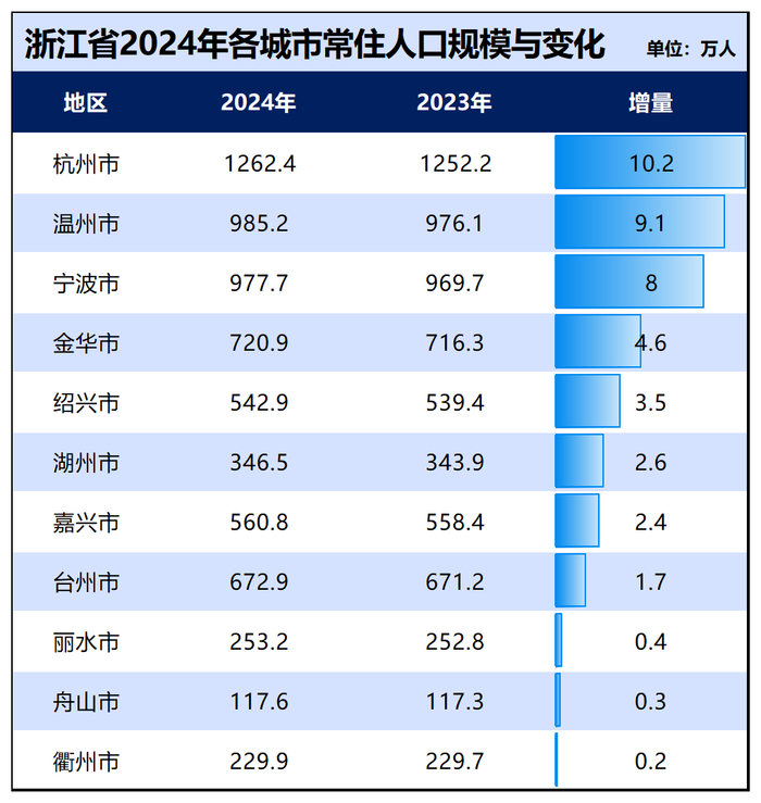 浙江:浙江省2024常住人口增加了43万人,增量位居内地31个省市第二位,仅次于广东。下辖的11个城市人口全部增长,是全国唯一一个下辖所有城市人口全部增长的省域。