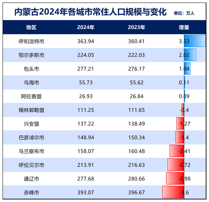 内蒙古:去年内蒙古常住人口减少了8万人,其下辖的9个地级市、3个盟,7个人口在减少,人口减少城市占比58.3%。