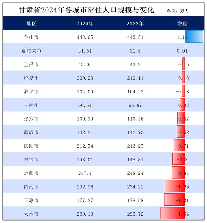 甘肃:去年甘肃省减少了7.14万人,下辖的14个市州,仅兰州与嘉峪关有人口增量,其余全部减少,人口减少城市占比85.7%。