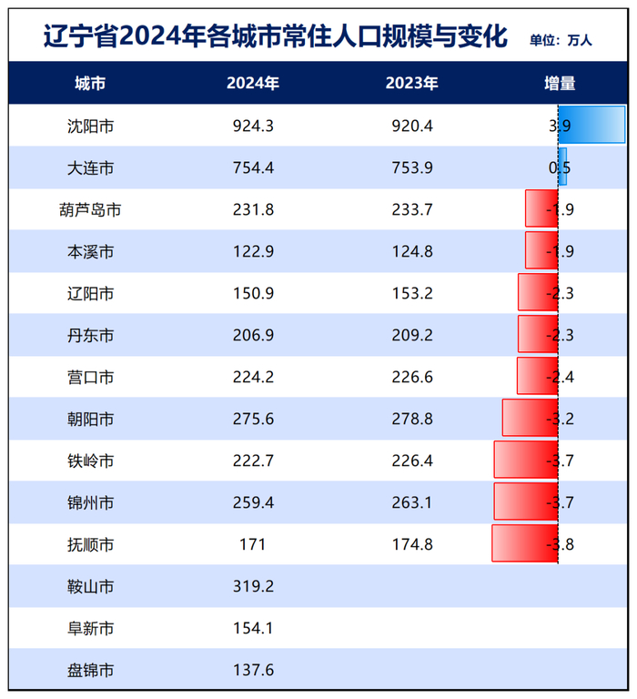 能够计算出人口变化的11个城市,只有沈阳、大连两个中心城市有人口增量,其余9个都在减少,减少比例同样远超一半。