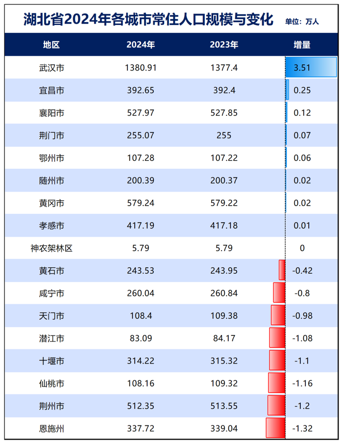 湖北:湖北省去年常住人口减少了4万人。下辖的12个城市、1个自治州、4个直管县,8个在减少,减少城市数量占比47%。