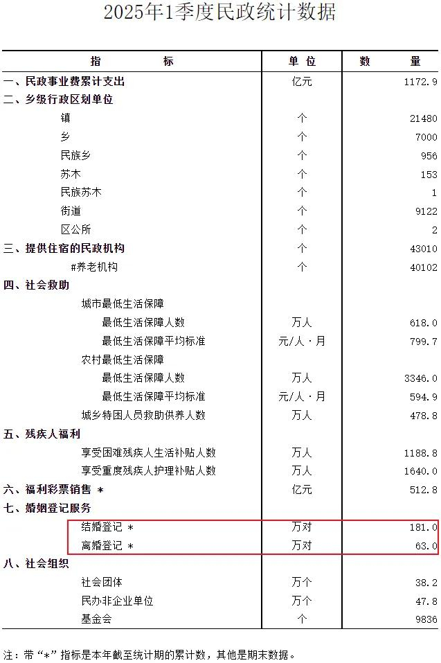 2025年一季度,全国结婚登记181万对,离婚登记63万对。