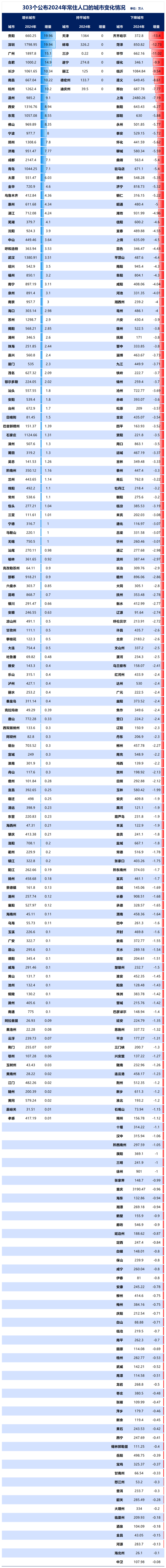 第一,目前有303个城市(包括直辖市、地级市、自治州、盟)公布了2024年常住人口数据。