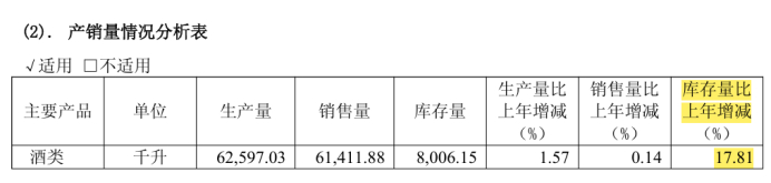 再结合迎驾贡的产销量数据,更是直接呈现动销缓慢的事实——2024年,公司生产量同比增长1.57%,销量同比仅增长0.14%,后者低于前者1.43%,导致库存量同比增长17.81%。