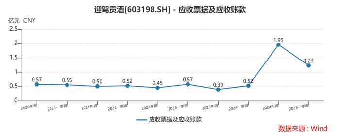 数据显示,2024年末,迎驾贡的应收账款为约1.95亿元,较2023年同比增长2.6倍;创下了上市以来的历史新高。到了2025年Q1,公司应收账款仍高达1.23亿元,较上一年同期增长约1.37倍。