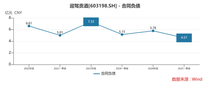 2024年,迎驾贡的合同负债为57.75亿元,较2023年年末的73.33亿元同比下滑超21%;2025年Q1,公司合同负债4.57亿元,较上年同期同比下滑约21%。
