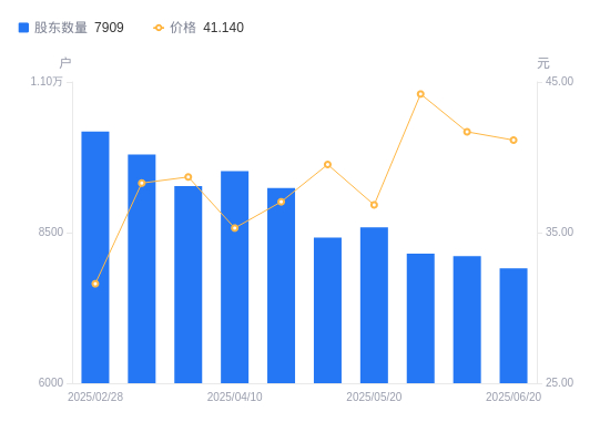 近一年(2024年6月20日至2025年6月20日),瑞联新材A股股东户数从9116户,减低至7909户,降幅13.24%,区间股价上涨64.79%。