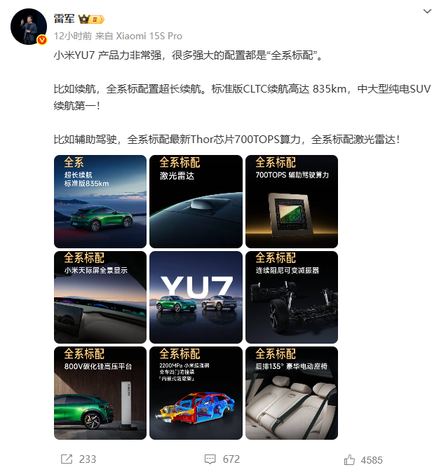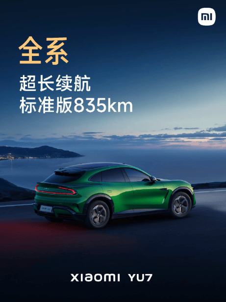 雷军在微博中透露,小米YU7将以“全系标配”作为其核心竞争力,直接拉高了同级别车型的门槛。尤其是835公里的CLTC续航里程。