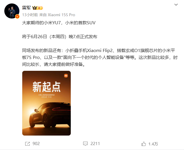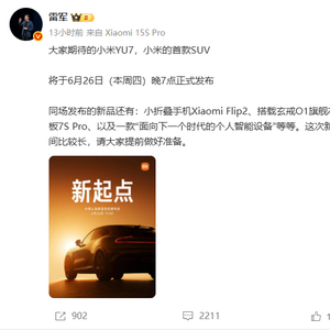6月23日,雷军宣布,小米首款中大型纯电SUV——小米YU7,将于6月26日正式发布。
