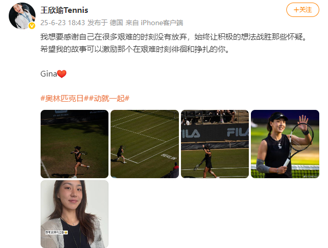 王欣瑜在个人中文社交媒体上晒出了一组自己的赛场图,并配文道:“我想要感谢自己在很多艰难的时刻没有放弃,始终让积极的想法战胜那些怀疑。希望我的故事可以激励那个在艰难时刻徘徊和挣扎的你。”