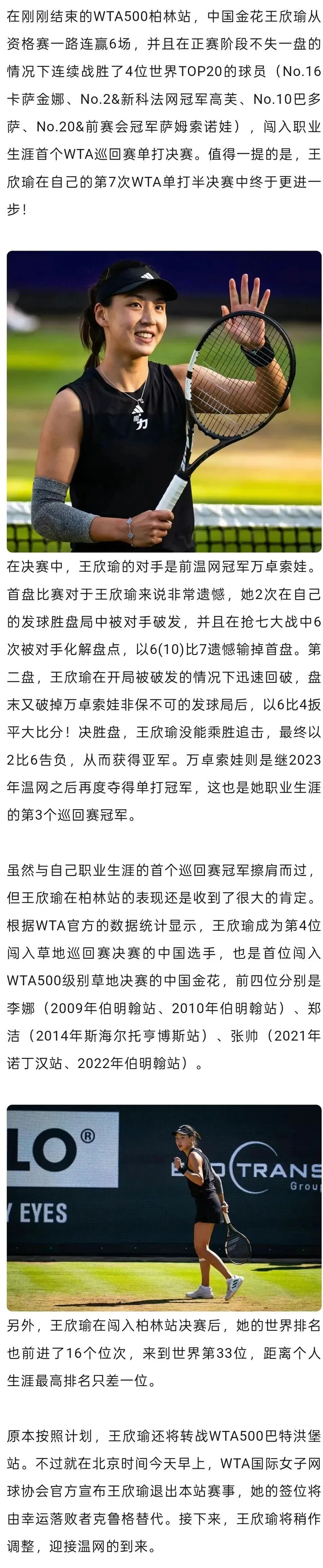 王欣瑜成为第4位闯入草地巡回赛决赛的中国选手,也是首位闯入WTA500级别草地决赛的中国金花。