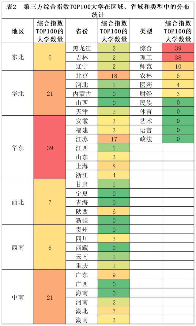 第三方综合指数排名TOP100的大学中,北京、江苏、广东入选的大学数量位居前3强,分别有18所、17所、9所。广东入选的9所学校,分别是中山大学、华南理工大学、暨南大学、深圳大学、华南师范大学、南方科技大学、南方医科大学、华南农业大学、广东工业大学。
